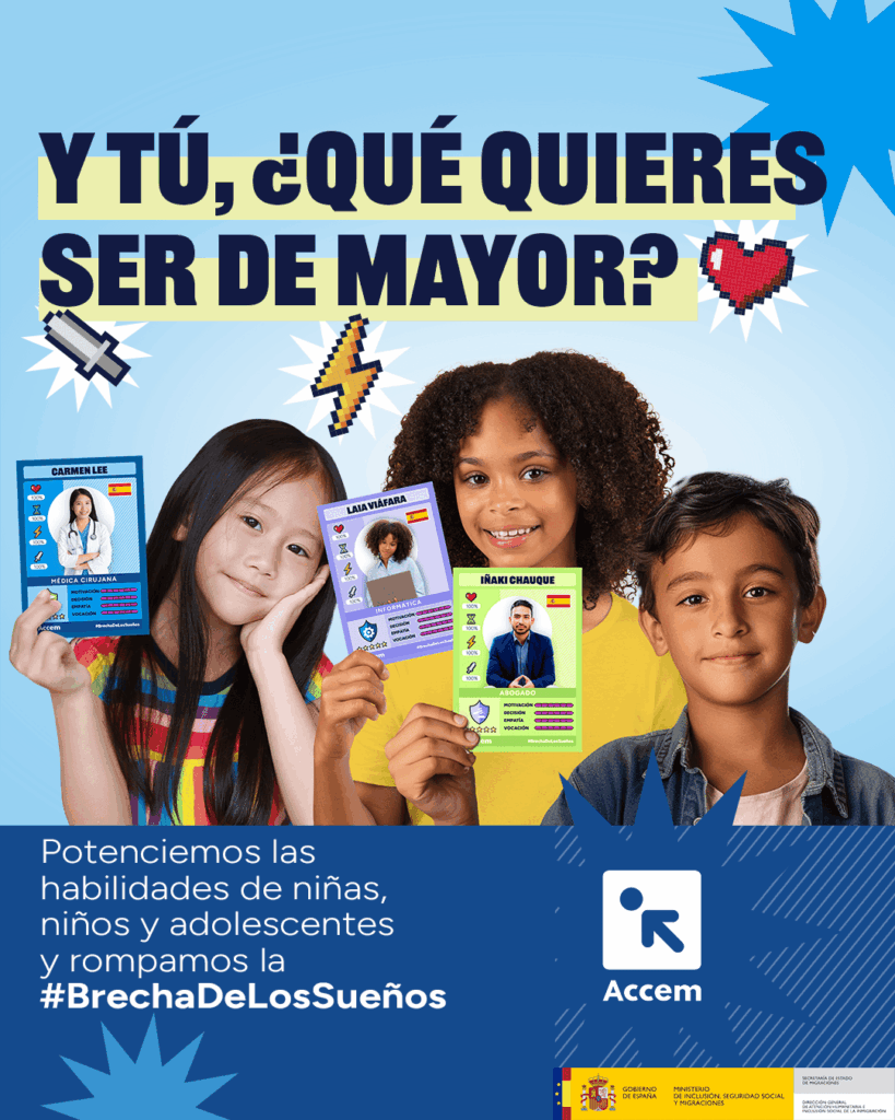 A partir de la pregunta “Y tú, ¿qué quieres ser de mayor?”, lanzamos esta campaña para abordar de manera positiva los discursos discriminatorios y los estereotipos que condicionan los sueños y aspiraciones de la infancia y la juventud culturalmente diversa. De manera transversal, se abordó la discriminación por razón de género que limita el potencial de las niñas y jóvenes. Para impulsar el mensaje de la campaña, contamos con la colaboración de 27 personas embajadoras en acciones de sensibilización en 13 ciudades de España y firmamos 22 alianzas con entidades privadas y organizaciones de la sociedad civil. También se fomentó la participación ciudadana a través de contenidos en redes sociales y la interacción a través del juego ‘Potencia tus cartas’, disponible en la web de la campaña.